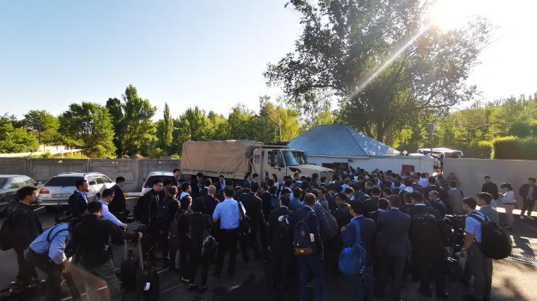 △清晨,報道上合峰會的記者正在等待進入阿拉爾恰國賓館。(央視記者張曉鵬拍攝)