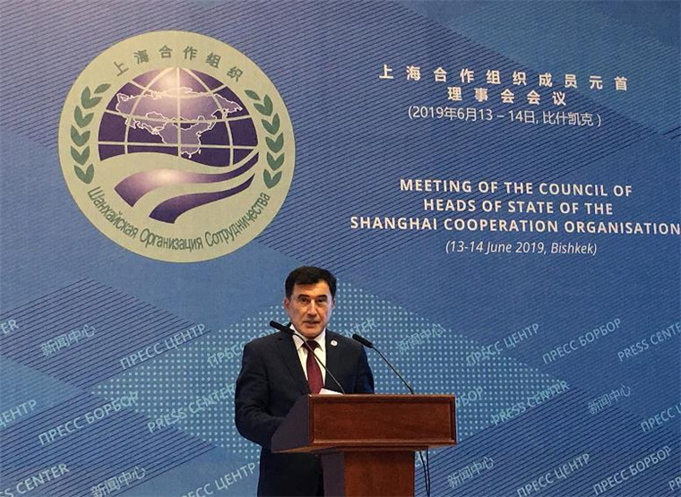 △當(dāng)?shù)貢r(shí)間14日下午,峰會(huì)新聞中心舉行新聞發(fā)布會(huì),上合組織秘書長(zhǎng)諾羅夫介紹本屆峰會(huì)成果。(央廣記者朱敏、馬喆拍攝)