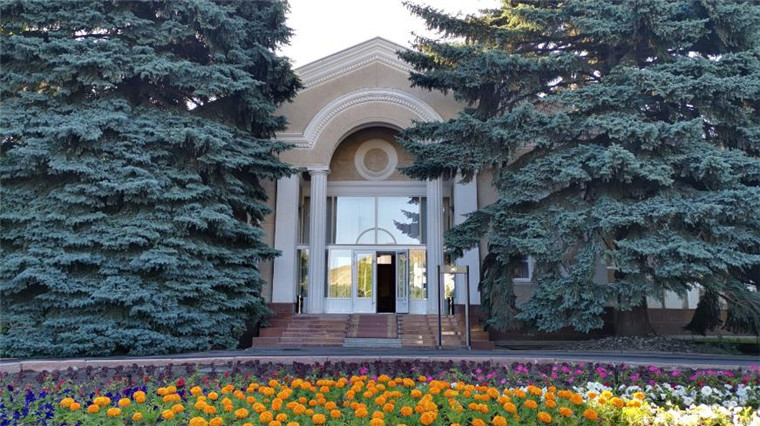 △當(dāng)天上午9點(diǎn)半,習(xí)近平在阿拉爾恰國賓館中這座蒼松掩映的小樓里會(huì)見了伊朗總統(tǒng)魯哈尼。(央視記者張曉鵬拍攝)