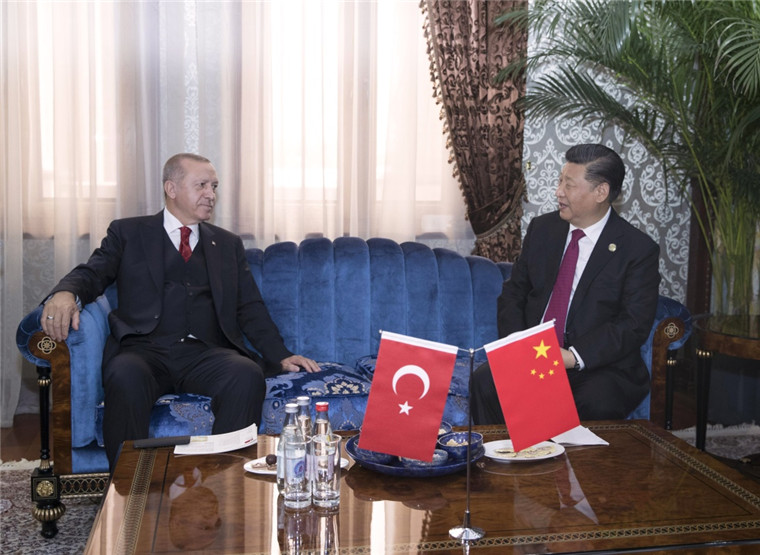 6月15日,國家主席習(xí)近平在杜尚別會見土耳其總統(tǒng)埃爾多安。新華社記者 王曄 攝