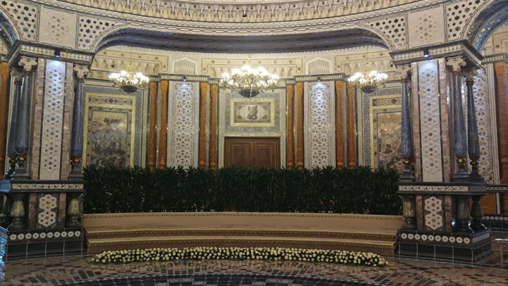 ?△這是習(xí)近平和各國領(lǐng)導(dǎo)人集體合影的納烏魯茲宮石畫廳。(央視記者黃京輝拍攝)
