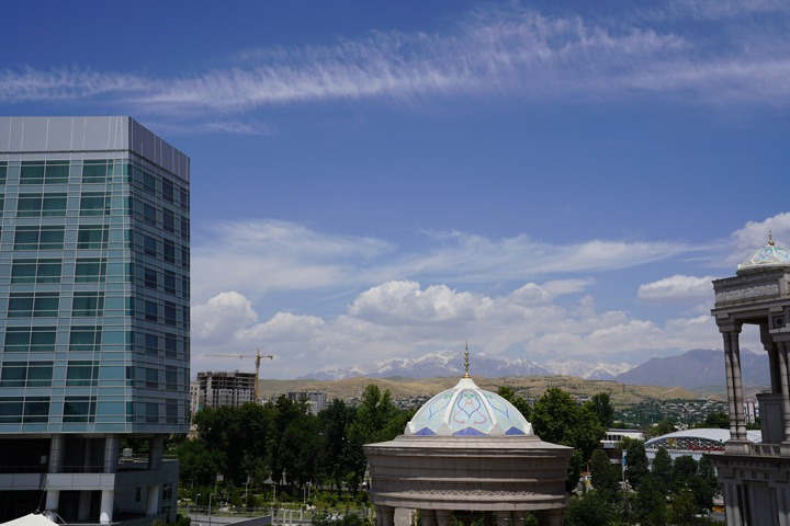 △走出金色大廳門口,可以眺望到遠(yuǎn)處的雪山。