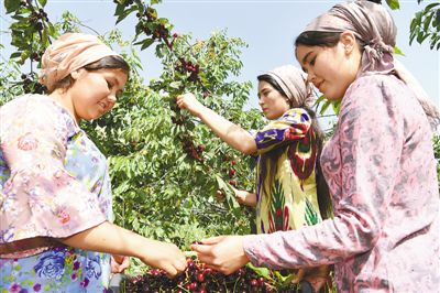 6月12日,在杜尚別以西的中塔合資櫻桃園里,員工正在采摘櫻桃。