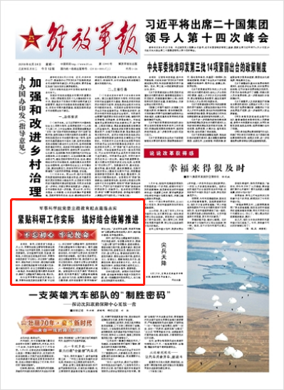 6月21日,軍事科學(xué)院主要領(lǐng)導(dǎo)圍繞全面學(xué)習(xí)領(lǐng)會習(xí)近平強軍思想,為全院作專題黨課輔導(dǎo)。針對教育時間緊、任務(wù)重、標(biāo)準(zhǔn)高,大項任務(wù)壓茬推進的實際,軍事科學(xué)院黨委在“不忘初心、牢記使命”主題教育中,緊貼科研工作實際,通過搞好統(tǒng)籌結(jié)合,注重把推進教育與完成重大任務(wù)、重大規(guī)劃項目、自主立項課題有機結(jié)合、一體推進,科學(xué)確定查擺問題的具體抓手,確保了主題教育開展起點高、落點實。請關(guān)注今日《解放軍報》的報道——