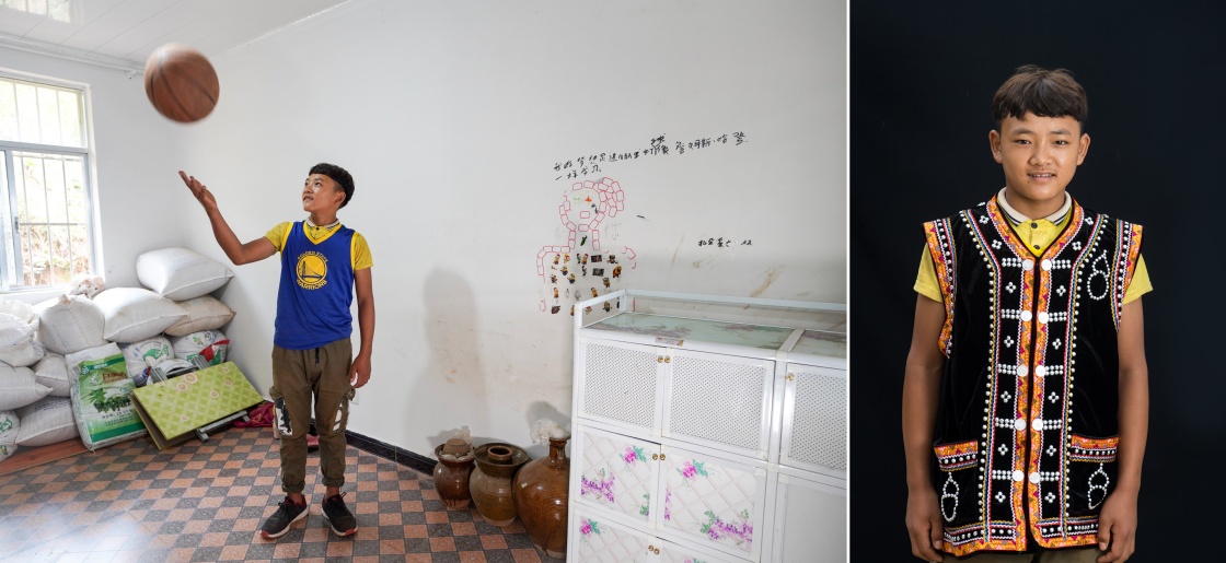 這是一張拼版照片。右圖:扎朵,拉祜族,今年14歲,家住云南省西盟縣勐梭鎮(zhèn)班母村十四組,勐梭鎮(zhèn)民族中學(xué)初一學(xué)生(6月16日新華社記者胡超攝);左圖:扎朵在房間展示他心愛的籃球(6月16日新華社記者秦晴攝)。他從小喜歡打籃球,偶像是籃球運(yùn)動員詹姆斯·哈登。