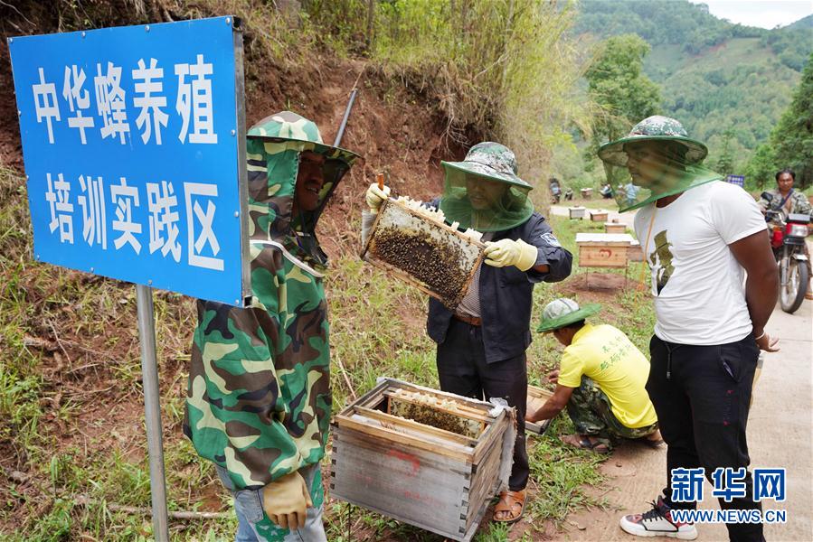 在云南省西盟縣勐梭鎮(zhèn)班母村中華蜂養(yǎng)殖基地,村民在學(xué)習(xí)養(yǎng)蜂技術(shù)(6月16日攝)。 精準(zhǔn)扶貧的春風(fēng),吹到了西南邊疆。在云南省西盟縣的拉祜山寨,人們告別了吃不飽、穿不暖、沒有安全住房的日子。學(xué)習(xí)先進(jìn)技術(shù),改變精神面貌,發(fā)展養(yǎng)蜜蜂、種甘蔗等甜蜜產(chǎn)業(yè),拉祜人的日子越過越甜。 新華社記者 秦晴 攝