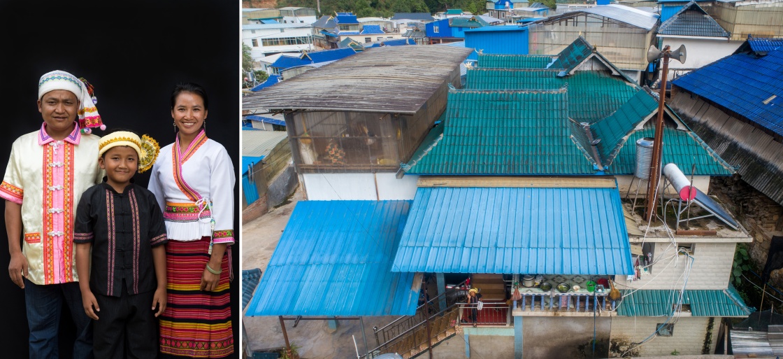 這是一張拼版照片。左圖:西雙版納傣族自治州勐海縣布朗山布朗族鄉(xiāng)老曼峨村布朗族村民巖干溫(左)一家合影(6月13日新華社記者秦晴攝);右圖:巖干溫家2012年建成的房子,左上角的玻璃房主要用于曬茶制茶。他家目前種植茶葉200畝,2019年春茶季收入近80萬(wàn)元(6月13日新華社記者胡超攝)。