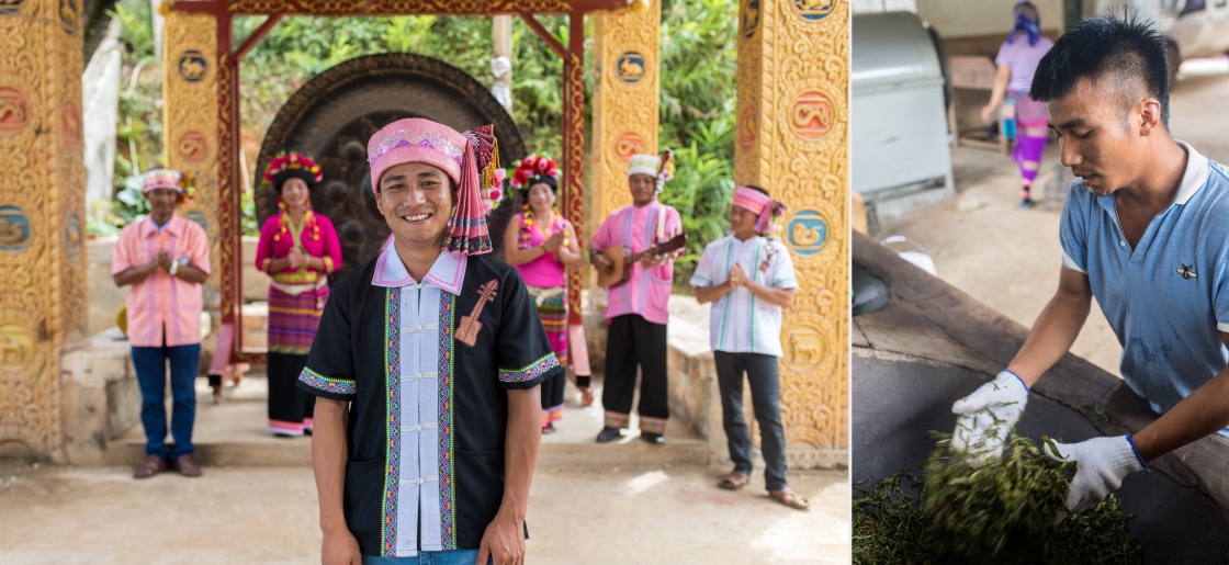 這是一張拼版照片。左圖:西雙版納傣族自治州勐海縣布朗山布朗族鄉(xiāng)老曼峨村村民巖煙叫(布朗族)。在他身后,村民在展示布朗彈唱(6月13日新華社記者胡超攝);右圖:巖煙叫在炒制剛剛采下的茶葉。他畢業(yè)于云南林業(yè)職業(yè)技術(shù)學(xué)院園林工程專業(yè),回鄉(xiāng)創(chuàng)業(yè)做茶葉初制加工,家里種植茶葉約80畝,2018年收入約20萬元(6月13日新華社記者秦晴攝)。