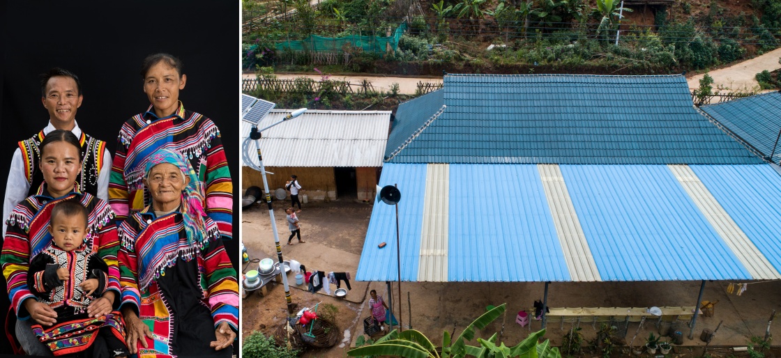 這是一張拼版照片。左圖:普洱市西盟佤族自治縣勐梭鎮(zhèn)班母村拉祜族村民扎莫(后排左)一家合影(6月16日新華社記者胡超攝);右圖:扎莫家2015年建成的房子。當(dāng)?shù)亟涤炅看螅芏嗉彝?huì)在房前搭建棚子,用于晾曬農(nóng)作物。扎莫一家家種植茶葉5畝,青貯玉米6畝,砂仁10畝,同時(shí)擔(dān)任小組長(zhǎng)、護(hù)林員等,去年全年收入近4萬(wàn)元(6月16日新華社記者秦晴攝)。