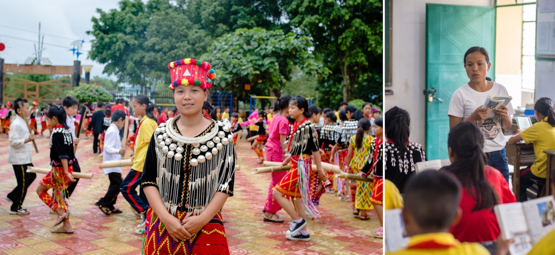 這是一張拼版照片。左圖:德宏傣族景頗自治州芒市西山鄉(xiāng)營盤民族小學(xué)老師雷木寬(景頗族)。在她身后,學(xué)生們在開展民族舞“目瑙縱歌”課間操(6月21日新華社記者胡超攝);右圖:雷木寬在課堂上(6月21日新華社記者秦晴攝)。