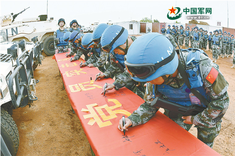 赴馬里維和警衛(wèi)分隊黨員突擊隊成員在橫幅上簽名。孫伯語攝