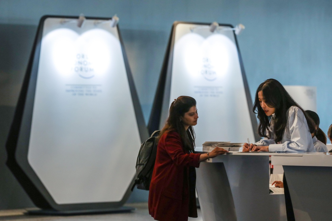 6月30日,志愿者在論壇主會(huì)場(chǎng)大連國(guó)際會(huì)議中心為參加論壇的外賓解答問題。新華社記者 潘昱龍 攝
