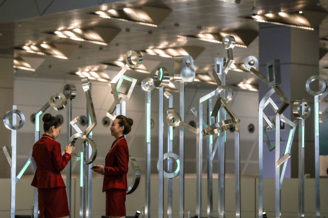 6月30日在論壇主會(huì)場(chǎng)大連國(guó)際會(huì)議中心拍攝的為夏季達(dá)沃斯論壇服務(wù)的工作人員。新華社記者 潘昱龍 攝