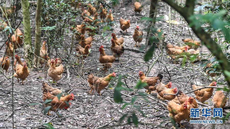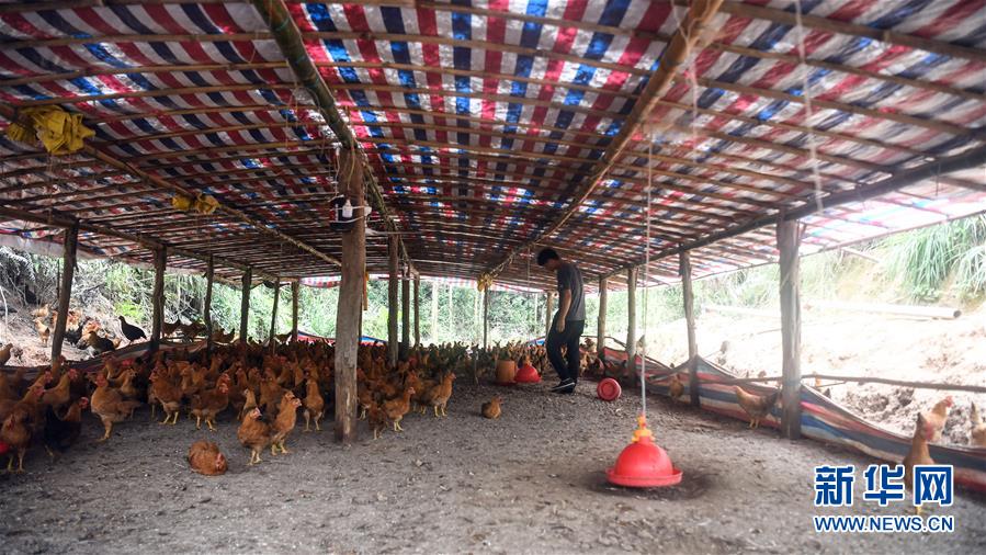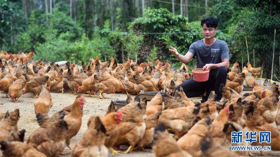 7月1日,欽州市欽南區(qū)那彭鎮(zhèn)那彭村養(yǎng)殖大戶文強在雞舍驅(qū)趕土雞到林中覓食。 近年來,廣西欽州市欽南區(qū)那彭鎮(zhèn)充分利用轄區(qū)內(nèi)林地,鼓勵當?shù)仞B(yǎng)殖大戶優(yōu)先扶持有勞動能力的貧困戶發(fā)展養(yǎng)雞產(chǎn)業(yè),助力脫貧增收。今年那彭鎮(zhèn)養(yǎng)雞戶約1800戶,預計每戶年出欄1.5萬羽。 新華社記者 張愛林 攝