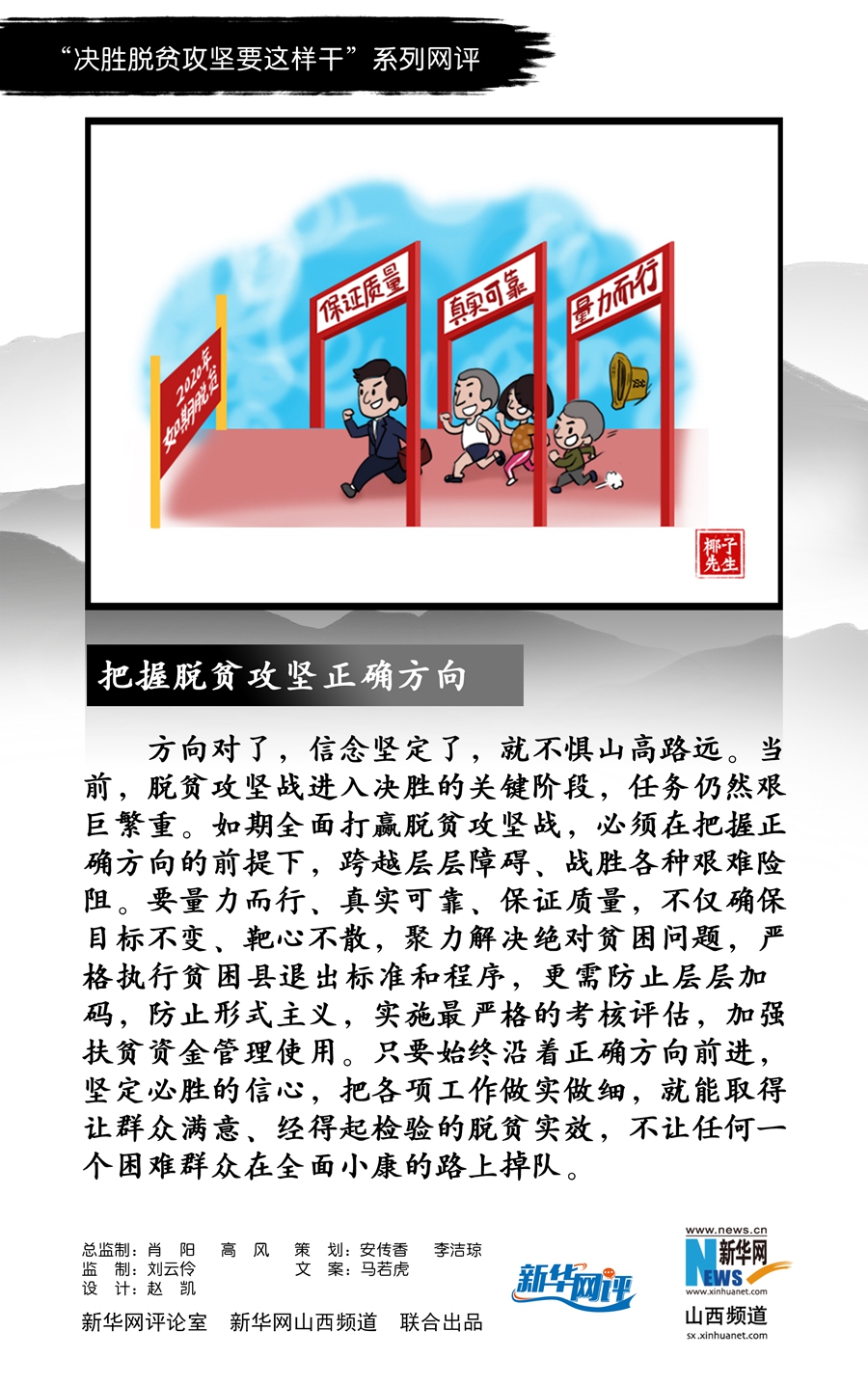 方向?qū)α耍拍顖?jiān)定了,就不懼山高路遠(yuǎn)。當(dāng)前,脫貧攻堅(jiān)戰(zhàn)進(jìn)入決勝的關(guān)鍵階段,任務(wù)仍然艱巨繁重。如期全面打贏脫貧攻堅(jiān)戰(zhàn),必須在把握正確方向的前提下,跨越層層障礙、戰(zhàn)勝各種艱難險(xiǎn)阻。要量力而行、真實(shí)可靠、保證質(zhì)量,不僅確保目標(biāo)不變、靶心不散,聚力解決絕對(duì)貧困問題,嚴(yán)格執(zhí)行貧困縣退出標(biāo)準(zhǔn)和程序,更需防止層層加碼,防止形式主義,實(shí)施最嚴(yán)格的考核評(píng)估,加強(qiáng)扶貧資金管理使用。只要始終沿著正確方向前進(jìn),堅(jiān)定必勝的信心,把各項(xiàng)工作做實(shí)做細(xì),就能取得讓群眾滿意、經(jīng)得起檢驗(yàn)的脫貧實(shí)效,不讓任何一個(gè)困難群眾在全面小康的路上掉隊(duì)。