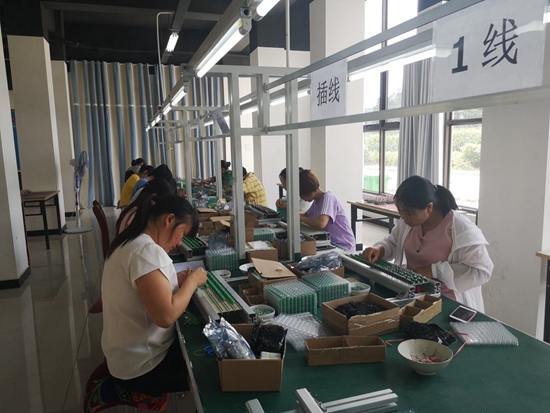 在移民安置小區(qū)一棟六層小樓的一樓,豎著一面“鎮(zhèn)巴縣社區(qū)扶貧工廠”的牌子,走進(jìn)去,寬敞的“車間”里,近百名婦女正在對太陽能節(jié)能燈具電路板進(jìn)行加工。