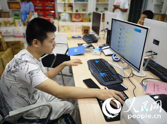 在位于安康漢濱區(qū)的扶貧超市里,今年22歲的孫陽正在用舌頭操作手機(jī),打理網(wǎng)上店鋪。孫陽是漢濱區(qū)瀛湖鎮(zhèn)清泉村村民,患有先天性腦癱和肢體殘疾,生活不能自理。他靠咬著筷子敲鍵盤,用舌尖開了網(wǎng)店,幫助農(nóng)戶代賣農(nóng)產(chǎn)品。