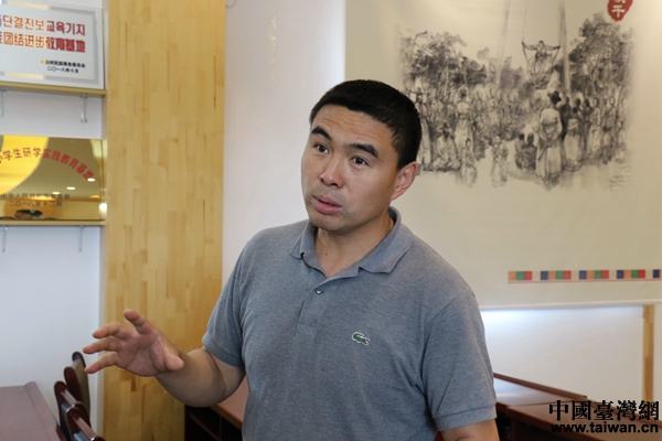 水南村第一書記姜云東向采訪團介紹村中產(chǎn)業(yè)發(fā)展概況。(中國臺灣網(wǎng) 尹賽楠 攝)