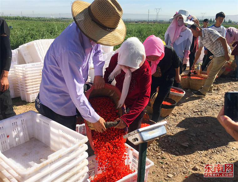 農(nóng)戶們正在把采摘的新鮮枸杞過(guò)秤。 東南網(wǎng)記者 顏財(cái)斌 攝