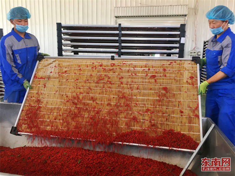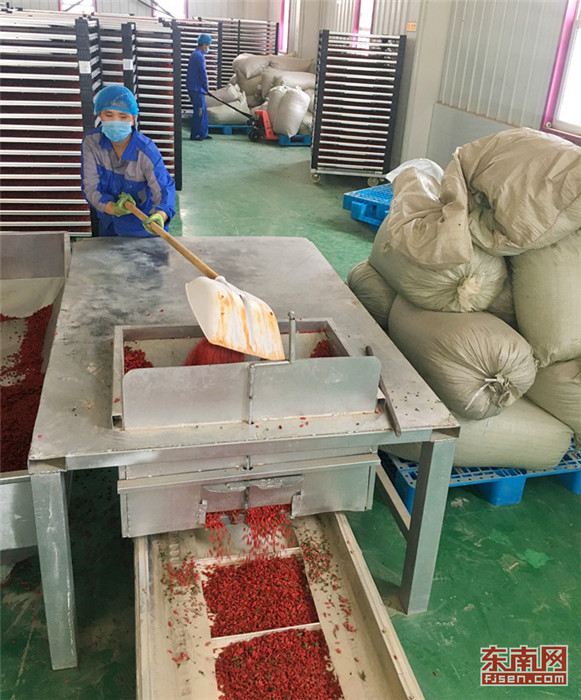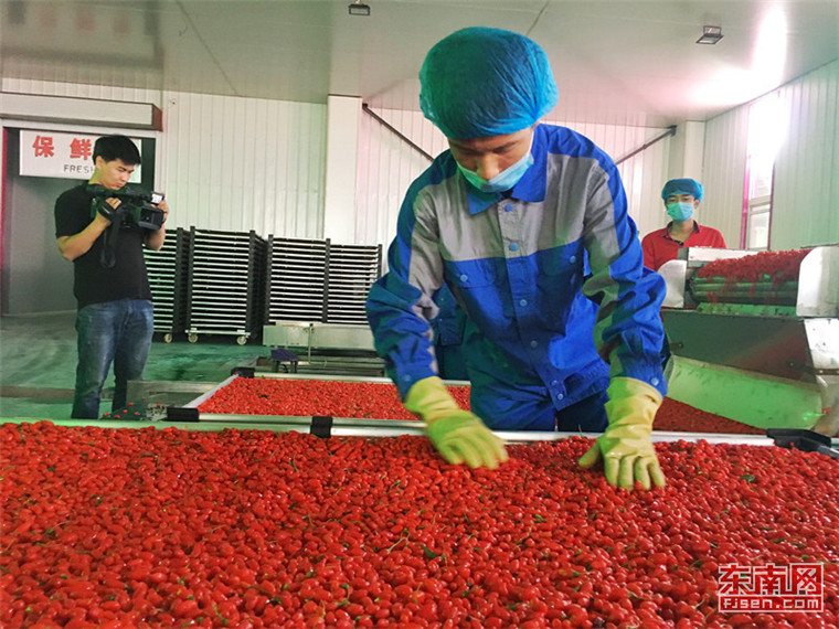 工人準(zhǔn)備將烘干后的枸杞進(jìn)行深加工。東南網(wǎng)記者 顏財(cái)斌 攝
