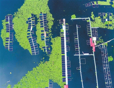福建省寧德市古田縣灣口村黃田鎮(zhèn)淡水草魚養(yǎng)殖基地水面上,漁船來回穿梭,水面上網(wǎng)箱鉤織出一個個幾何圖形。