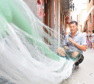 福建省寧德福安市下白石鎮(zhèn)下岐村一位船民在自家屋前編織漁網(wǎng)。