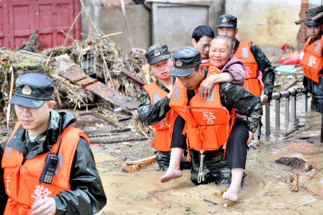 2019年5月17日,武警福建總隊三明支隊官兵在永安市小陶鎮(zhèn)老街轉(zhuǎn)移被困群眾。新華社發(fā)(李濤 攝)