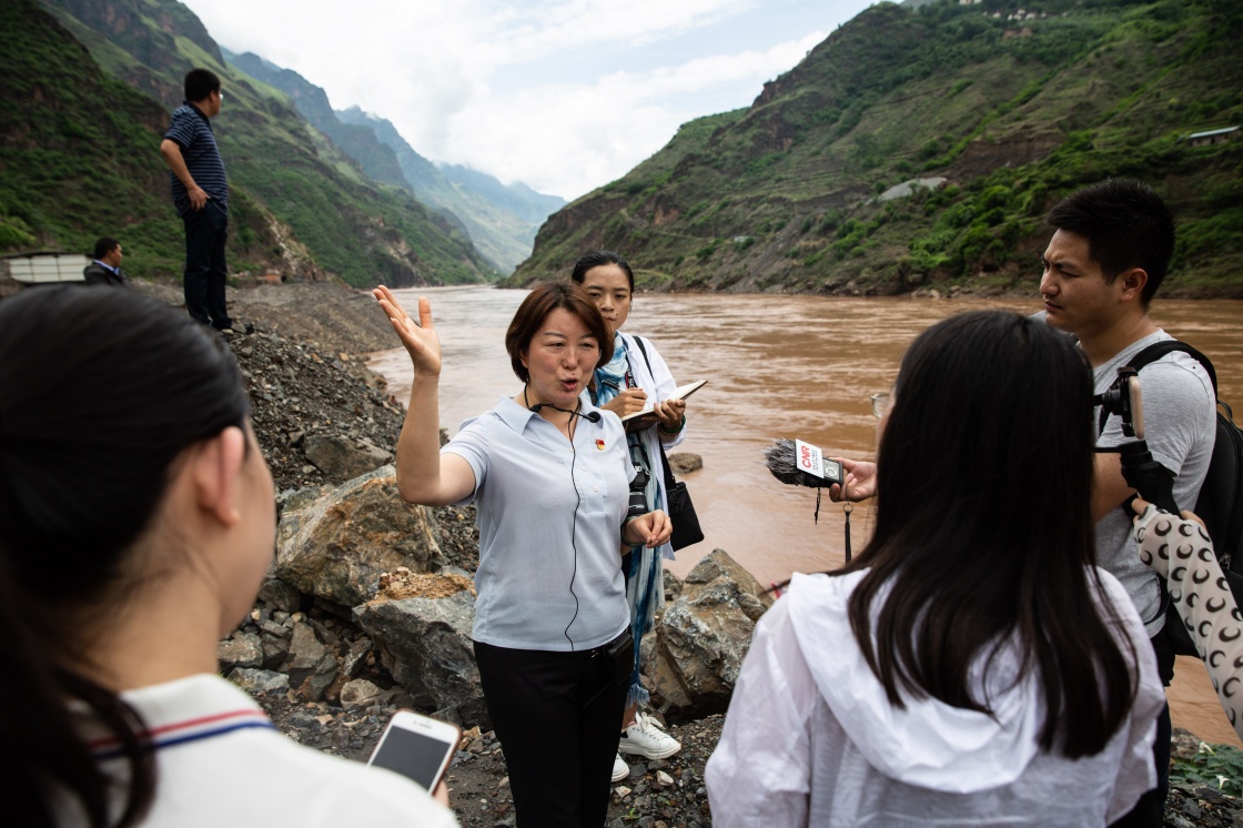 7月21日,祿勸縣委黨史研究室主任李迎春(中)在皎平渡為記者介紹。新華社記者 吳壯 攝