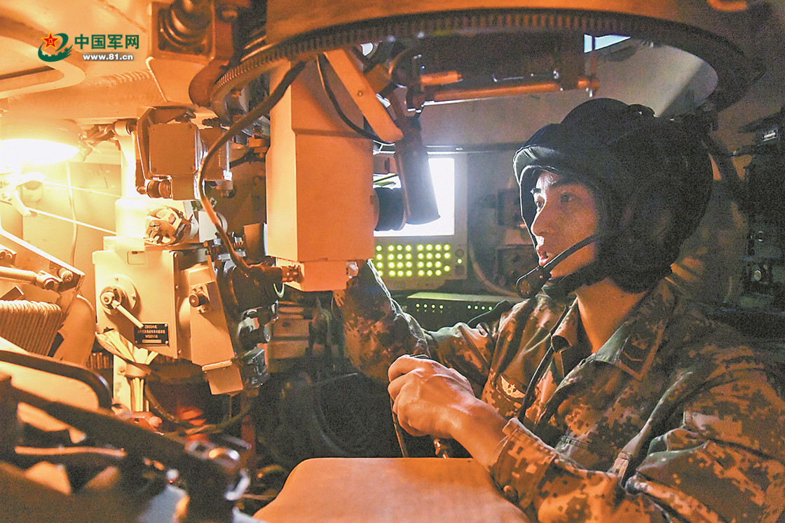 在夜間實彈戰(zhàn)術(shù)考核中,步戰(zhàn)車車長快速做好戰(zhàn)斗準(zhǔn)備。