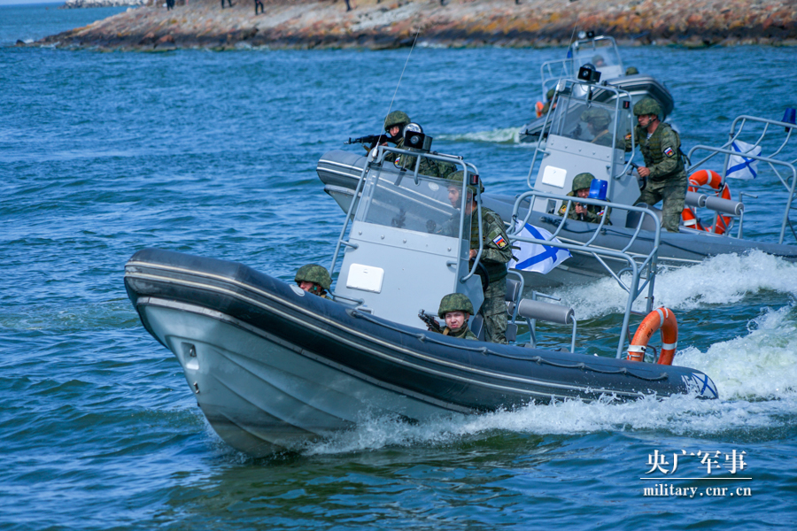 俄海軍陸戰(zhàn)隊員進(jìn)行兩棲登陸作戰(zhàn)表演。吳浩宇 攝