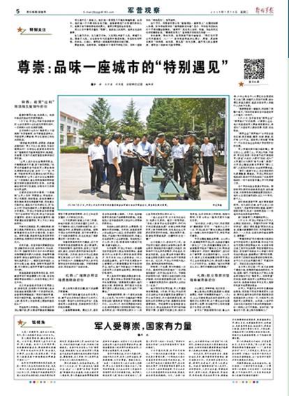 身為軍人的記者一行,連日來穿梭于鷹城大地,受尊崇的感覺油然而生:車站、醫(yī)院、銀行、行政服務(wù)大廳等公眾服務(wù)單位隨處可見“尊崇軍人,優(yōu)待軍屬”的標(biāo)語、標(biāo)牌,現(xiàn)役軍人免費(fèi)乘坐市內(nèi)公共汽車、各類停車場對軍車及軍人駕駛的私家車免費(fèi)提供服務(wù)……