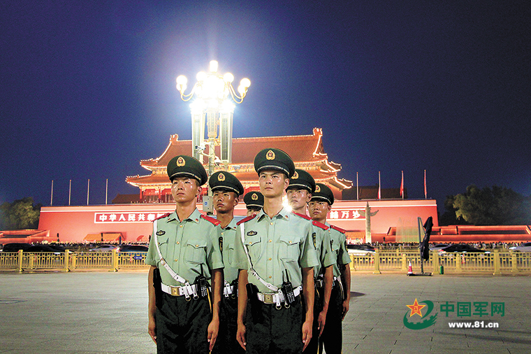一座城樓,將哨兵們的夜晚一分為二。天安門城樓前的射燈,在夜色里雕刻出整座城樓的全貌。