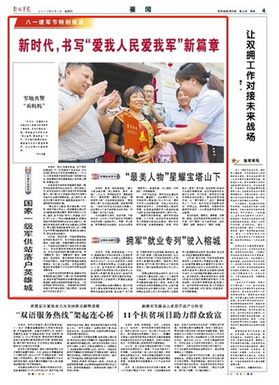 為慶祝建軍92周年,延安市委、市政府決定,從今年4月份開(kāi)始在全市范圍內(nèi)評(píng)選并表彰一批退役軍人、軍嫂、軍人家庭、擁軍模范的先進(jìn)典型,在全社會(huì)營(yíng)造“尊崇軍人、敬重英雄、關(guān)心國(guó)防、支持部隊(duì)”的濃厚氛圍。
