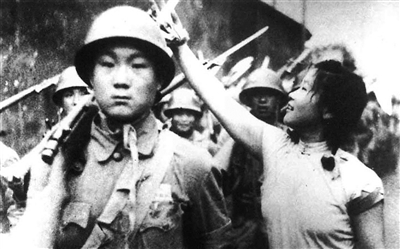 1949年7月6日,上海舉行軍民大游行,歡天喜地慶解放。一位上海姑娘把鮮花掛到了解放軍戰(zhàn)士的槍上。