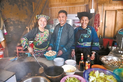 湖南湘西十八洞村,過去因?yàn)樨毟F而出名。2013年11月,習(xí)近平總書記在這里首次提出“精準(zhǔn)扶貧”。如今的十八洞村已經(jīng)脫貧,并且入選首批全國鄉(xiāng)村旅游重點(diǎn)村名單。圖為該村首家農(nóng)家樂“巧媳婦”的廚房里,主人在忙著為游客炒菜。(資料圖片)