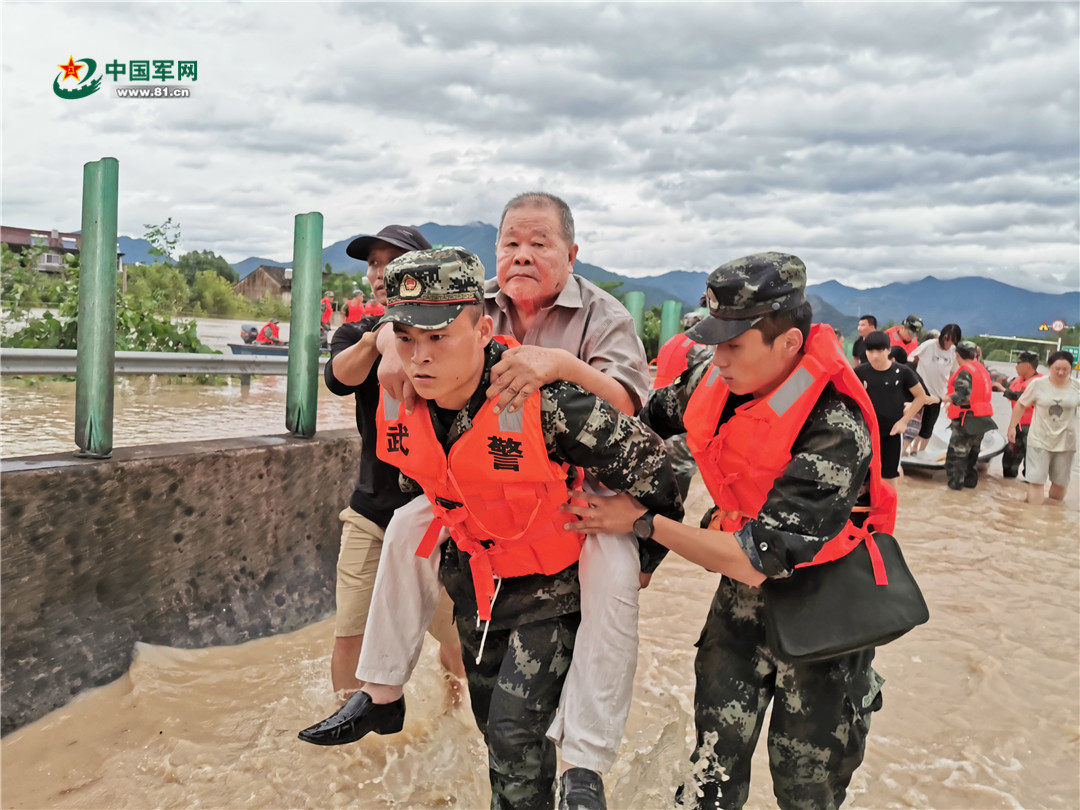 圖為武警臺(tái)州支隊(duì)官兵轉(zhuǎn)移臨海市永豐鎮(zhèn)受內(nèi)澇圍困的群眾。