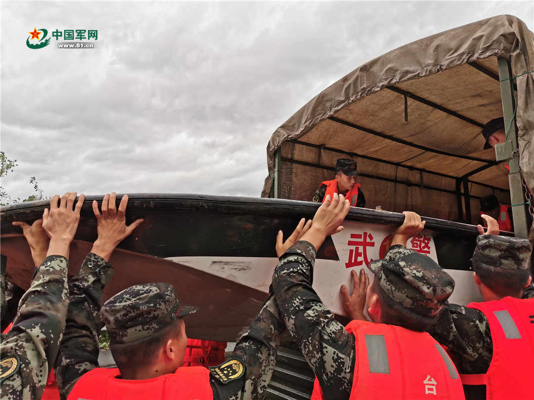 圖為武警臺(tái)州支隊(duì)官兵搬運(yùn)沖鋒舟。