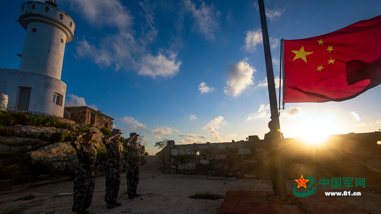 王仕花與島上駐守的民兵一同升起國旗。中國軍網(wǎng)記者馮開華攝