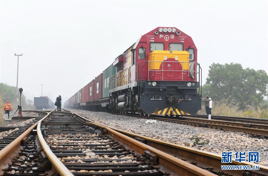 這是搭載著35個(gè)集裝箱的中歐班列(廈門(mén)—布達(dá)佩斯)從海滄站開(kāi)出(2018年1月19日攝)。新華社記者 林善傳 攝
