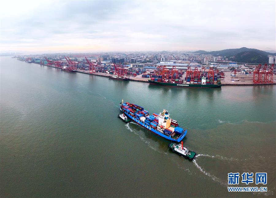 在福建自貿(mào)區(qū)廈門(mén)片區(qū)東渡港區(qū),一艘貨輪向碼頭靠攏(2017年8月26日無(wú)人機(jī)拍攝)。 新華社記者 姜克紅 攝
