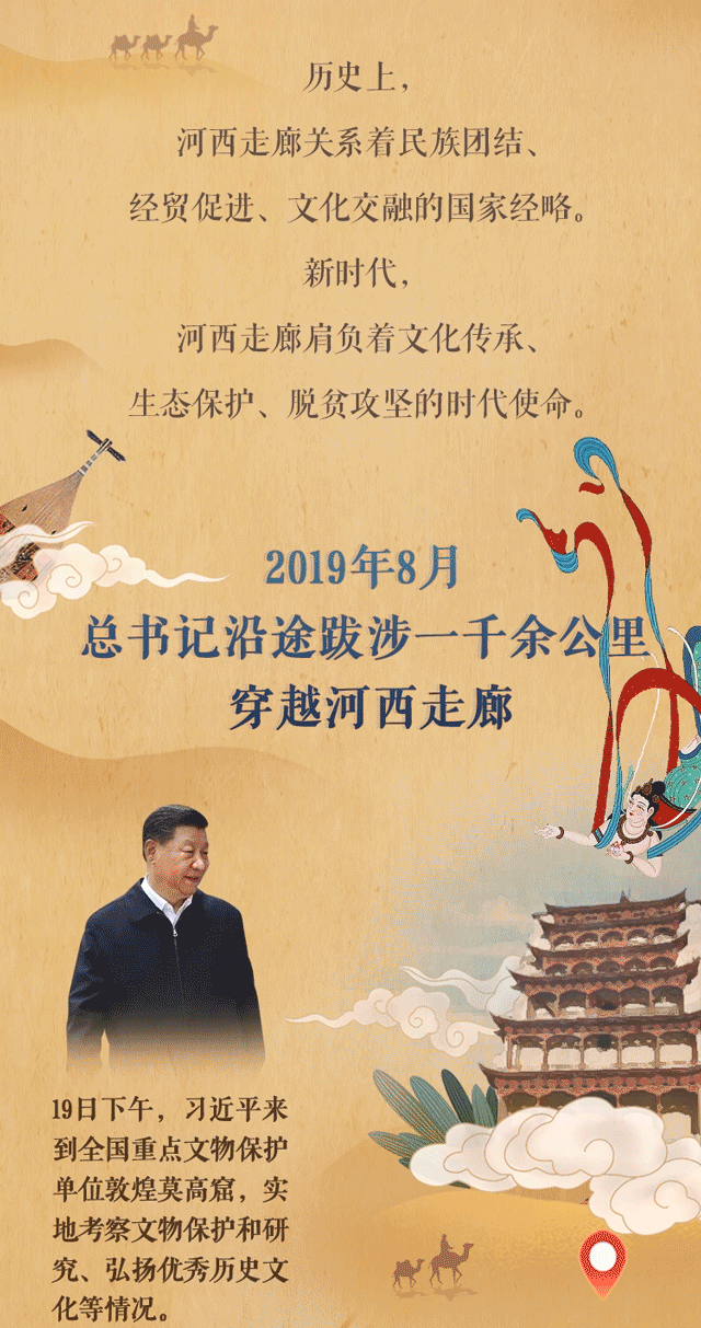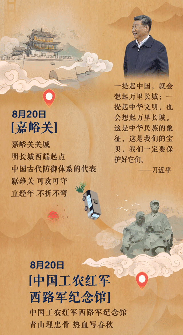 8月19日,習(xí)近平抵達甘肅調(diào)研。他風(fēng)塵仆仆、星夜兼程,沿河西走廊,自西向東,先后來到敦煌,嘉峪關(guān),張掖,武威,蘭州等地,看文物保護,談文化傳承,察生態(tài)建設(shè),進移民新村,話百姓生活。