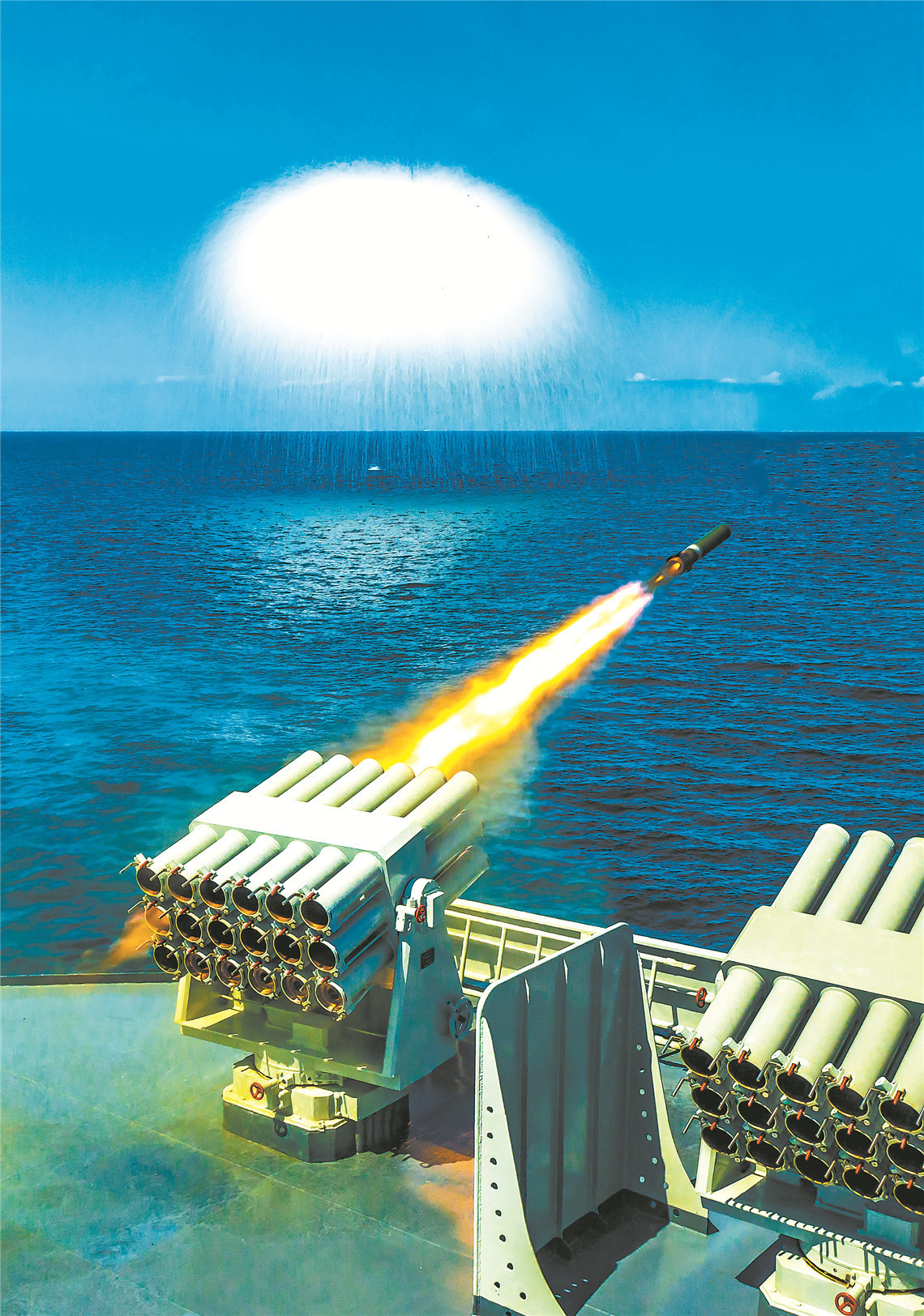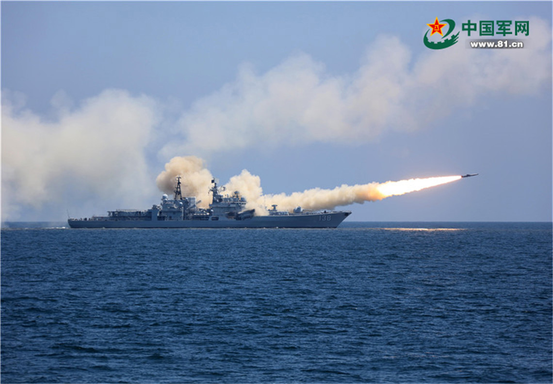 2019年8月中旬,南部戰(zhàn)區(qū)海軍某驅逐艦支隊組織艦艇編隊開展對抗演練。圖為艦艇發(fā)射實彈。錢春燕 攝