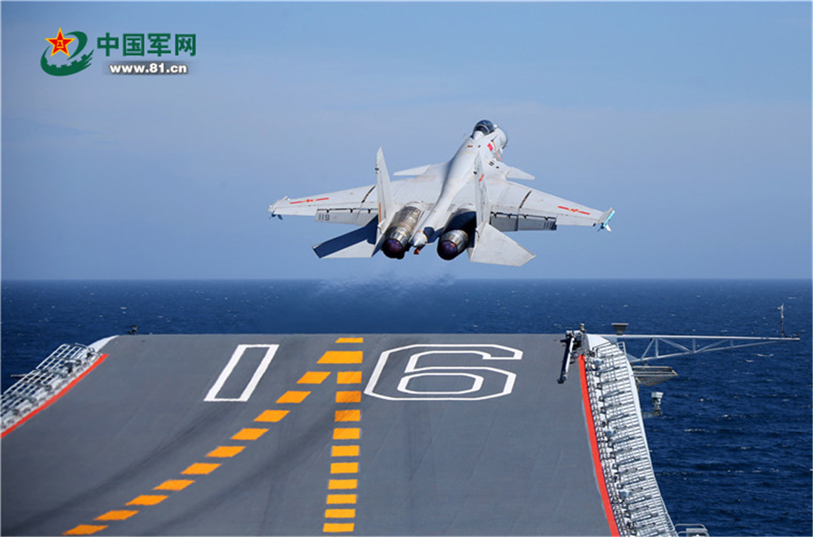 殲-15艦載戰(zhàn)斗機從遼寧艦飛行甲板滑躍起飛。李唐 攝