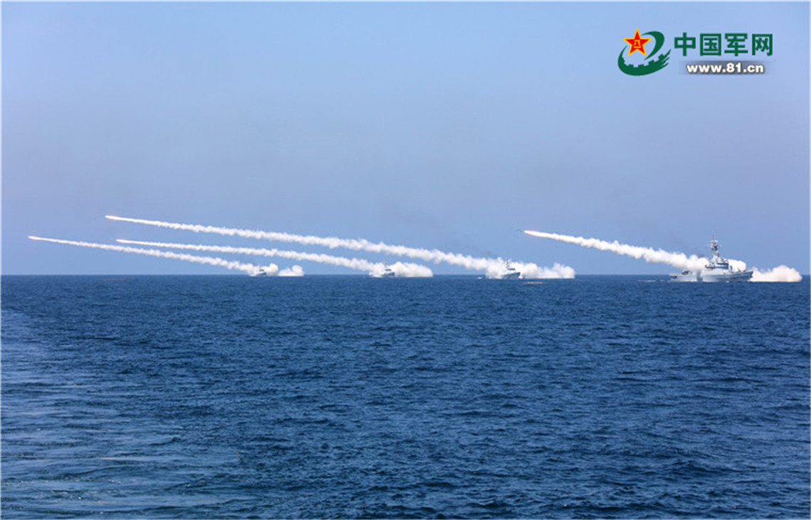 2017年8月7日,海軍在黃海、渤海相關海空域組織實兵實彈對抗演習,最大限度檢驗體系作戰(zhàn)能力、戰(zhàn)法訓法、武器裝備效能,共實射各型導彈數十枚。這是水面艦艇齊射反艦導彈。李唐 攝