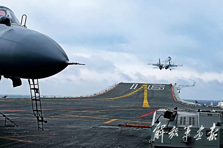 殲-15艦載戰(zhàn)斗機滑躍起飛。