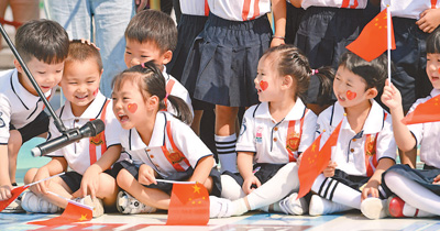 9月2日,在陜西西安大雁塔南廣場,小朋友們揮舞國旗,爭先恐后湊近話筒為祖國歌唱。當(dāng)日,慶祝新中國成立70周年大型全媒體活動《歌唱祖國·一首歌一座城》走進(jìn)古都西安。