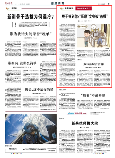 官兵們的吐槽引起了旅首長的高度重視。不久后,一份規(guī)范文電下發(fā)時間的細則出爐:除特殊情況外,機關(guān)各部門不得在節(jié)假日、休息日、每日20時后下發(fā)文電通知;要給基層留有處理文電的時間。細則下發(fā)后,文書們的煩惱隨之化解,闕天雄喜不自禁地哼起了那首歌:“終于等到你……”