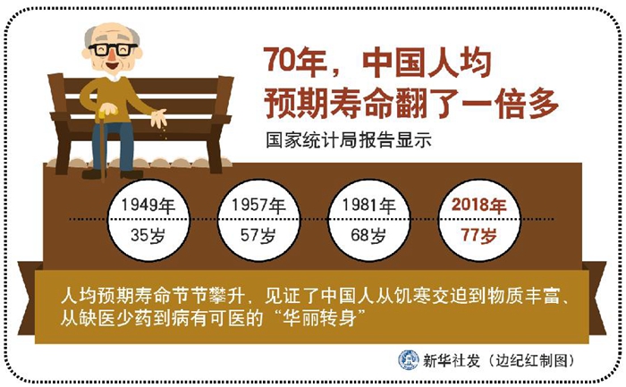 小病奪命成歷史,長命百歲不稀奇。70年,中國人均預(yù)期壽命從35歲增長到77歲,翻了一倍還多。