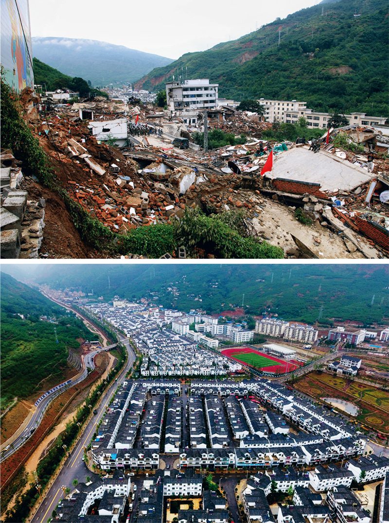2014年8月3日,云南昭通市魯?shù)榭h發(fā)生6.5級(jí)地震,群眾生命財(cái)產(chǎn)和基礎(chǔ)設(shè)施遭受巨大損失。在黨中央的關(guān)懷下,魯?shù)榘褳?zāi)后恢復(fù)重建和打贏脫貧攻堅(jiān)戰(zhàn)相結(jié)合,使龍頭山鎮(zhèn)不僅獲得了重生,還擺脫了貧困,實(shí)現(xiàn)了生產(chǎn)生活大變樣、社會(huì)事業(yè)大跨越、基礎(chǔ)設(shè)施大提升、產(chǎn)業(yè)結(jié)構(gòu)大調(diào)整。上圖為地震災(zāi)后的龍頭山鎮(zhèn)(張廣玉/攝);下圖為恢復(fù)重建后的龍頭山鎮(zhèn)新貌(丁世新/攝)。 昭通市委宣傳部供圖