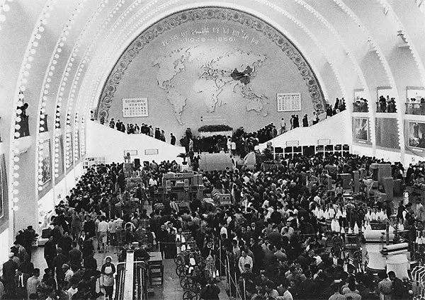 1956年11月10日,中國(guó)國(guó)際貿(mào)易促進(jìn)委員會(huì)主辦的中國(guó)出口商品展覽會(huì)在廣州中蘇友好大廈開(kāi)幕。這是來(lái)賓參觀工業(yè)館大廳。新華社記者 杜修賢 攝